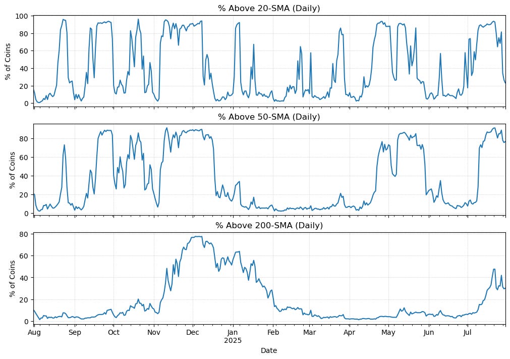 My best performance comes from sustained long-term trends. One of these indicators is when the % of total coins above the 200-SMA starts rising, as we’ve seen in late 2024, and we’re seeing now. Those are the times where my system really shines. Why? Well, we want sustained trends, and a measure of those trends is how well the assets you’re trading are holding above/below certain moving price averages.