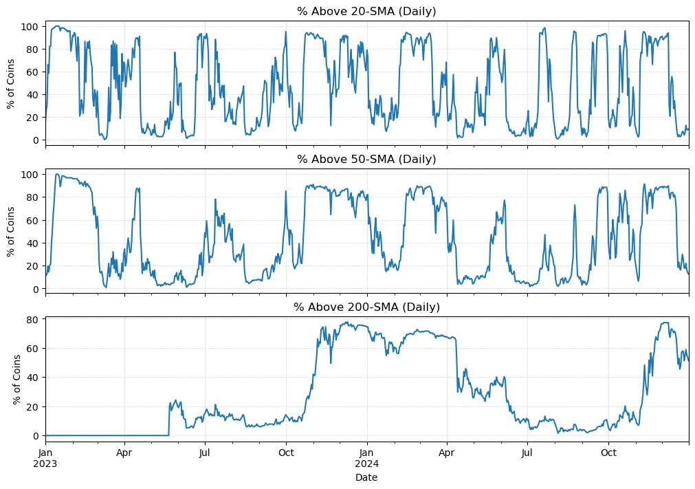 If we take a look at other periods like late 2023 to early 2024, we can see that there were many times where the % of coins above short-term SMA’s declined while the higher timeframe uptrend continued relatively strong.