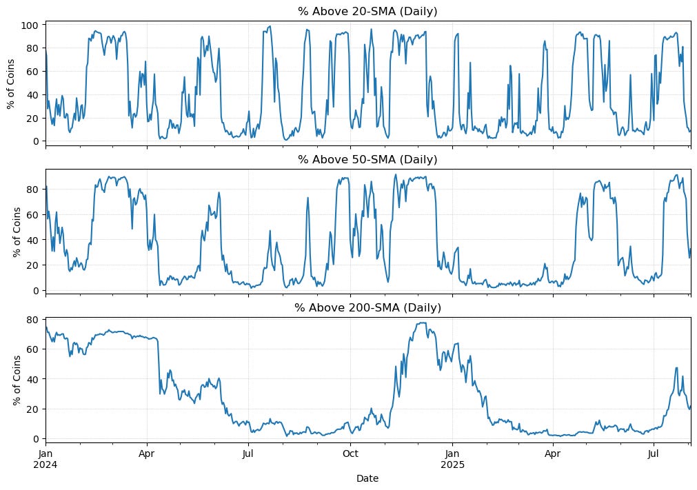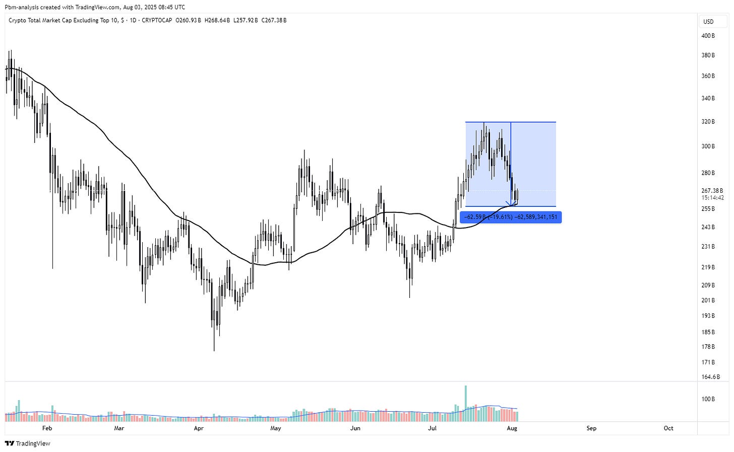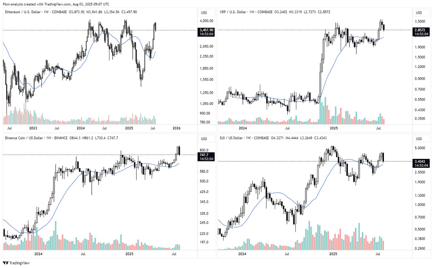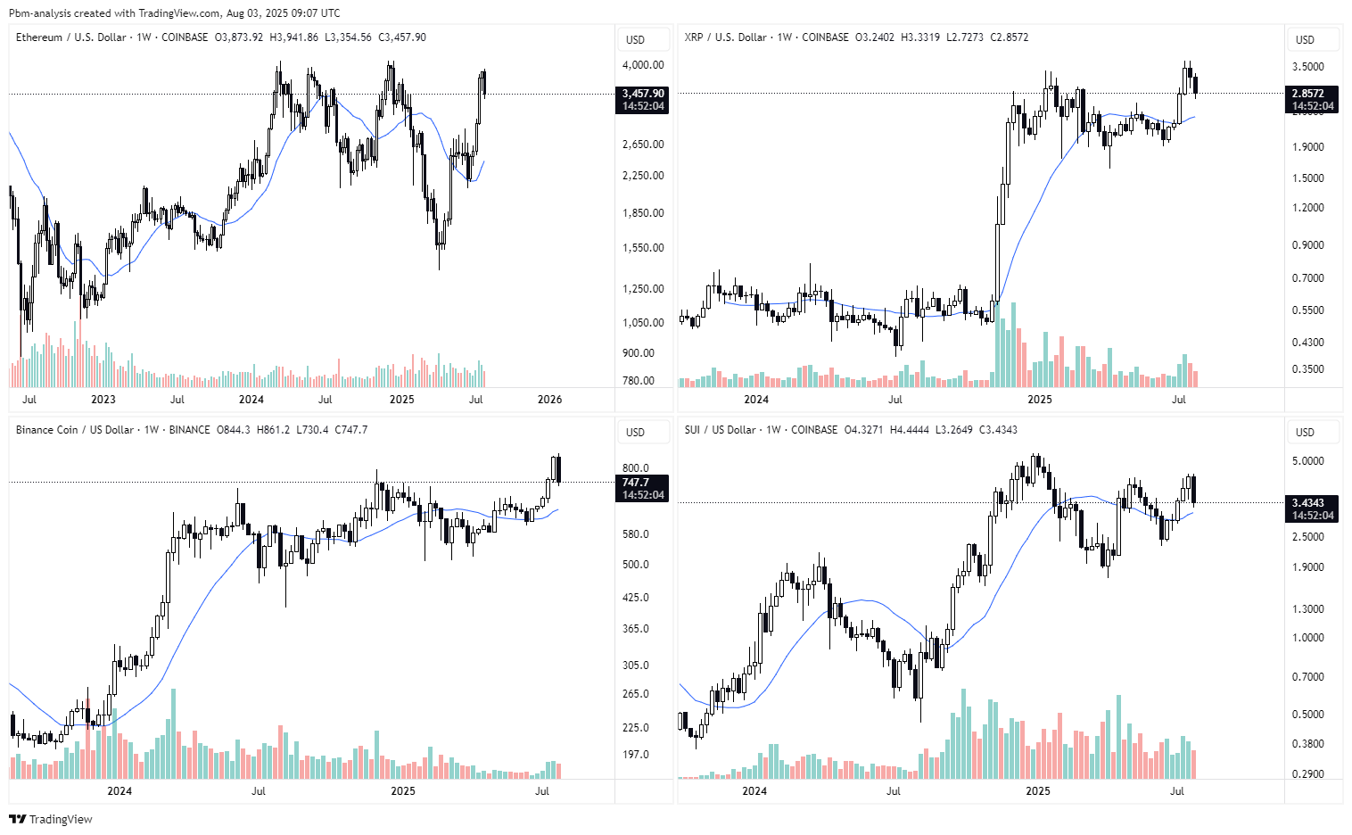 If we look at the major coins that have been leading this move, such as ETH, XRP, BNB, SUI, etc, they are still on relatively strong higher timeframe uptrends, by most technical measures.