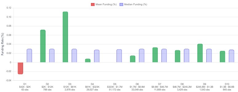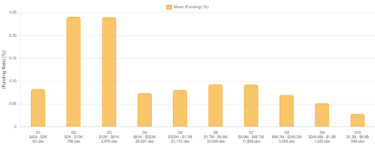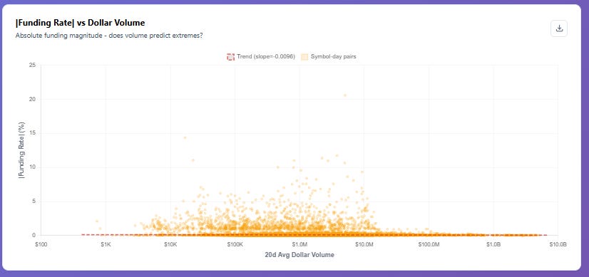 We can see that as volume scales higher, the variance of funding decreases. Goes right into what I was just mentioning from my own observations when I attempted to harvest the largest funding rates. They were usually hard to get because these were smaller coins, and many times, I found myself squeezing some allocation in the books, for little to no profit after it was all and done. Just headaches. Not saying that there’s no opportunity there, just my observation trading it, skill issue perhaps.