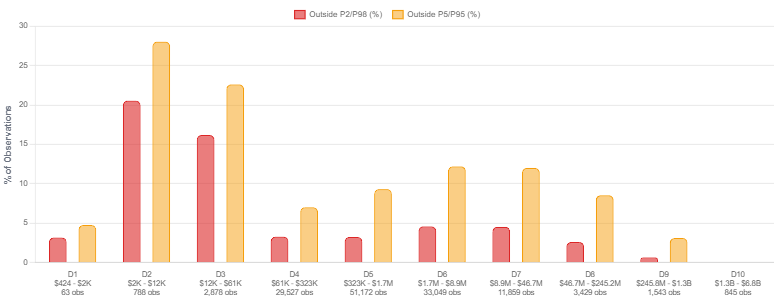 If we look at the outlier frequency by volume decile it shows that the left tail of volume (smaller coins) are a factory of outliers.