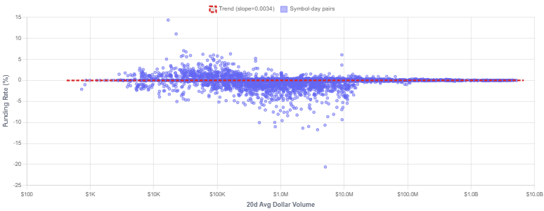 What’s interesting is that although there’s no clear relationship between dollar volume and funding, there’s an interesting behavior at the right end of the tail of dollar volume.