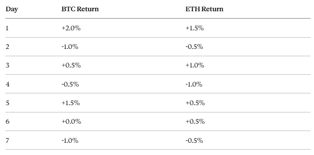 Let’s make it practical. Say we have 7 days of returns for BTC and ETH: