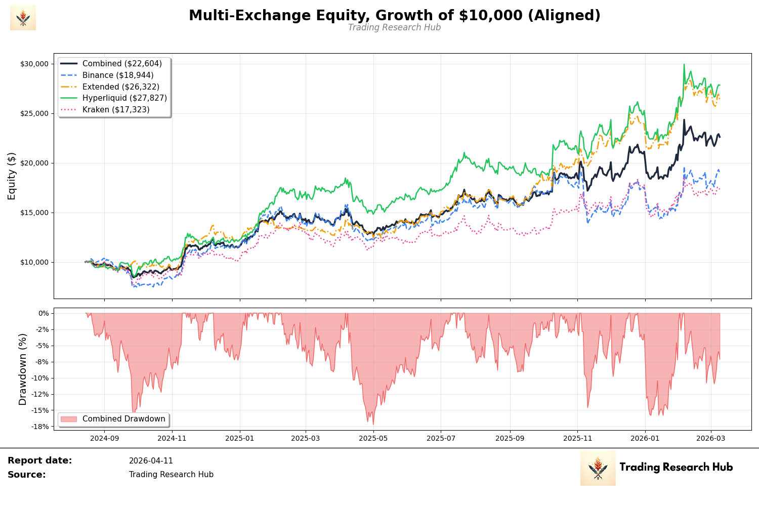 Below there’s 4 simulated equity curves, by exchange (binance, extended, hyperliquid, kraken) for a standard crypto momentum model.