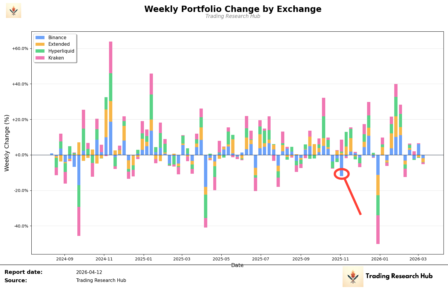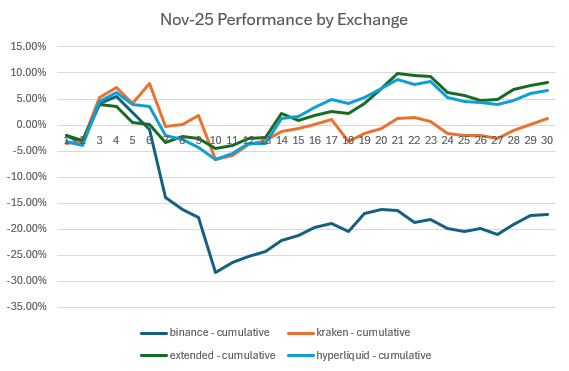 Most days the exchanges are pretty aligned in returns. This makes sense as the underlying model is the same. But something rather interesting happened in early November-25 (mostly on the 7th and 10th)…