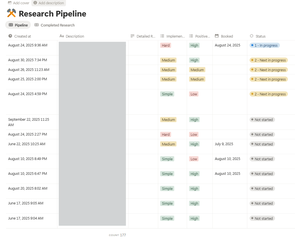 I store all of the ideas I find in an organized notion database, where I rank them by different attributes, that I consider important of that particular piece of research. Right now, I have 177 ideas I want to research, and that pipeline is growing faster than I can close them.
