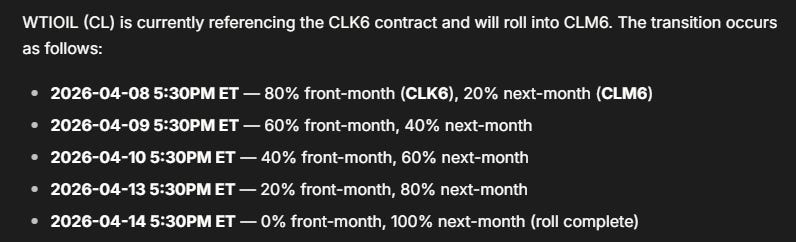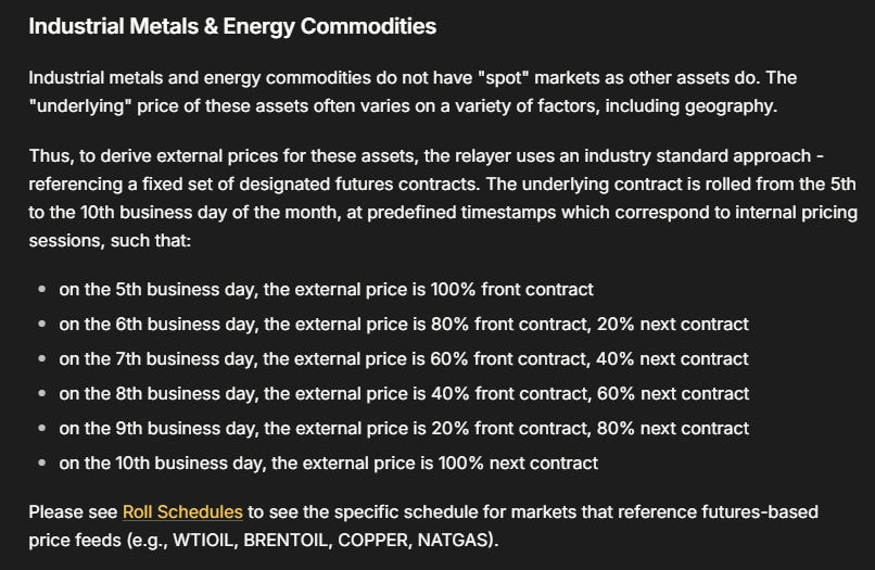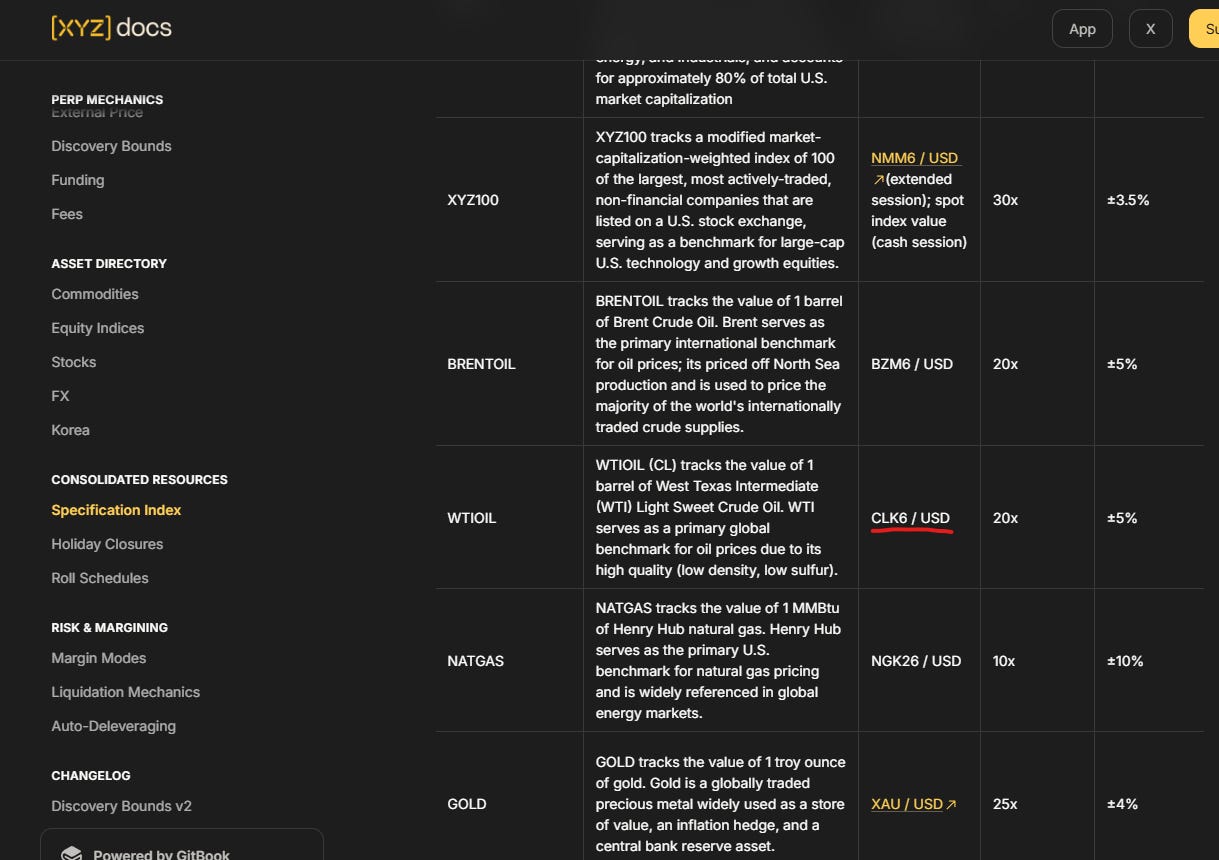 If we go to the deployer’s (tradexyz) documentation of this contract, we find that the WTIOIL Oracle is currently the CLK6 futures contract, which is the Crude Oil front-month futures contract.