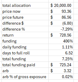 However we have 406% funding to pay, lets again assume it stays the same and we will be paying 1.11% a day for that exposure. That will be a total of 156.5 hours until the full roll which is about 6.52 days. Given the $10,000 HYPERLIQUID leg exposure we will pay about -$725.24 in funding and the arb is wiped out.