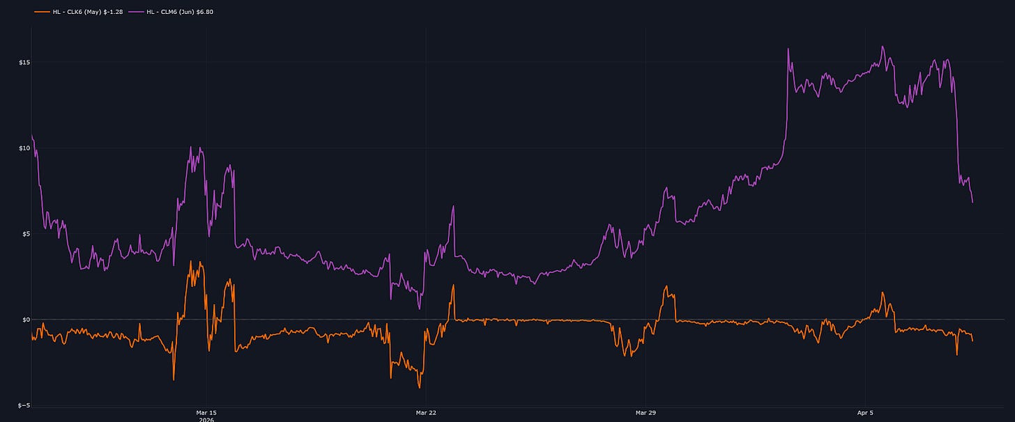 Given that expectation, the market is already discounting the current front-month contract price for that of the June contracts. Obviously the market isn’t waiting for the exact second to trade at new prices. This means that we’re trading at a sticky discount to the front-month (CLK6) price.