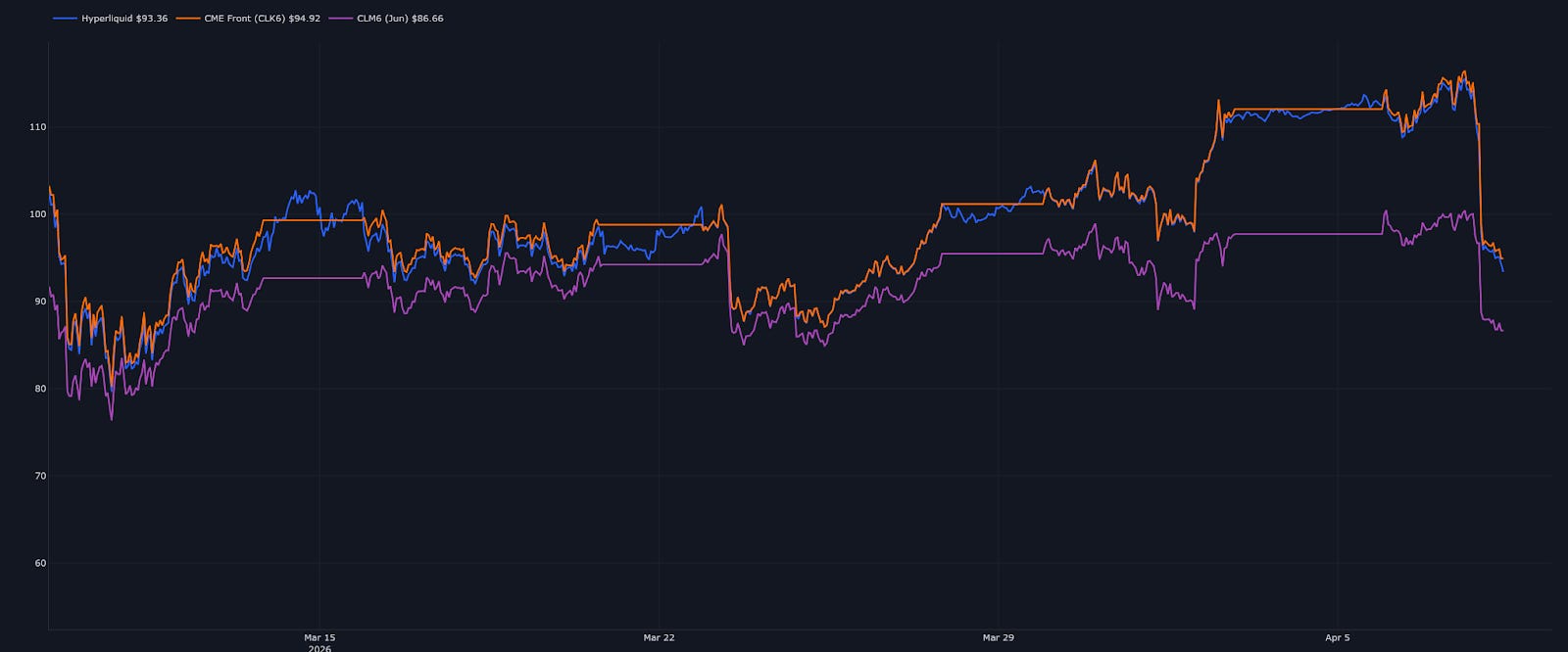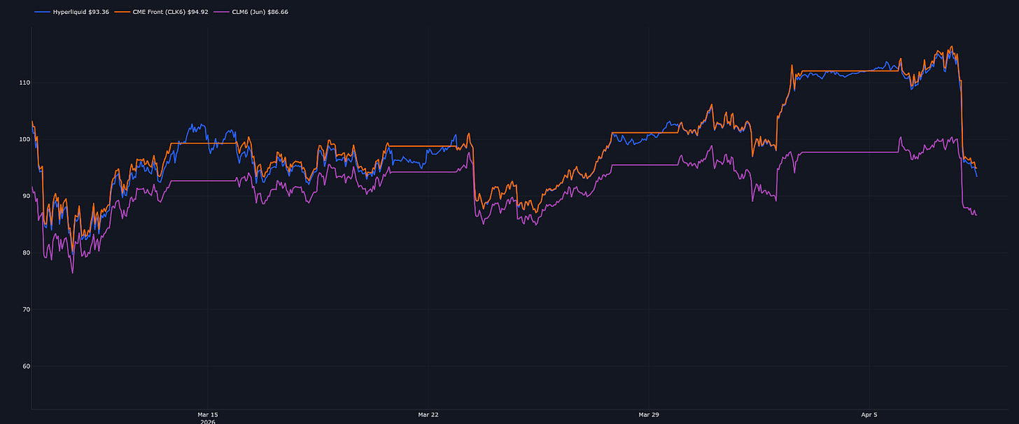 The WTIOIL-USDC contract on Hyperliquid tracks the price of the front-month WTI futures contract which is the nearest-expiry oil delivery contract on the CME. Think of the oil futures market as a chain of monthly contracts, each representing a barrel delivered at a specific date: